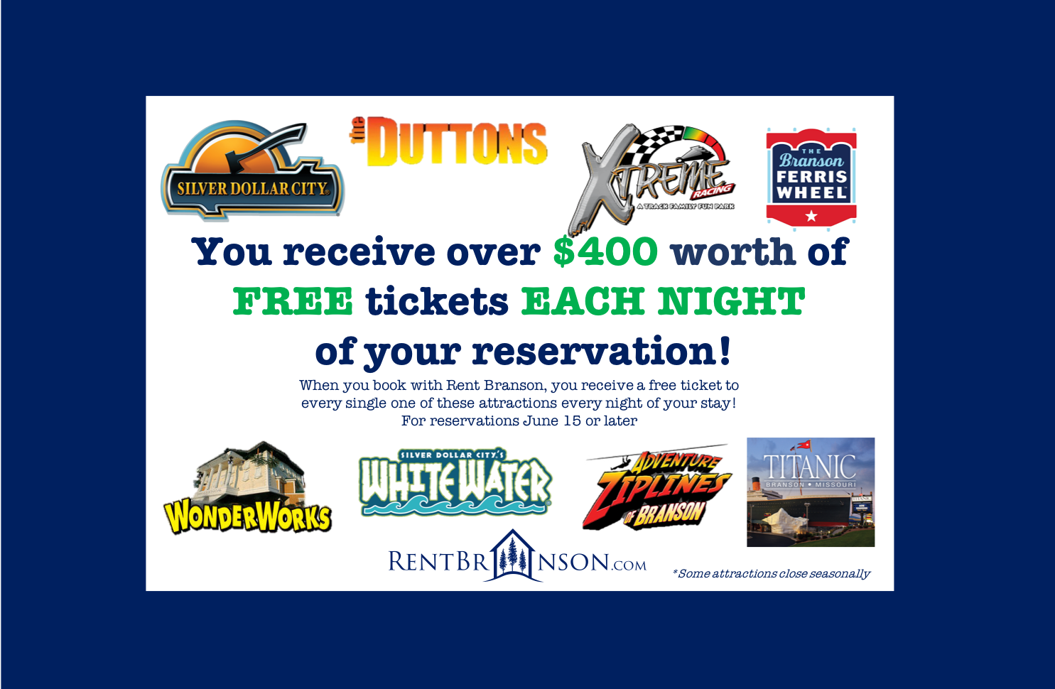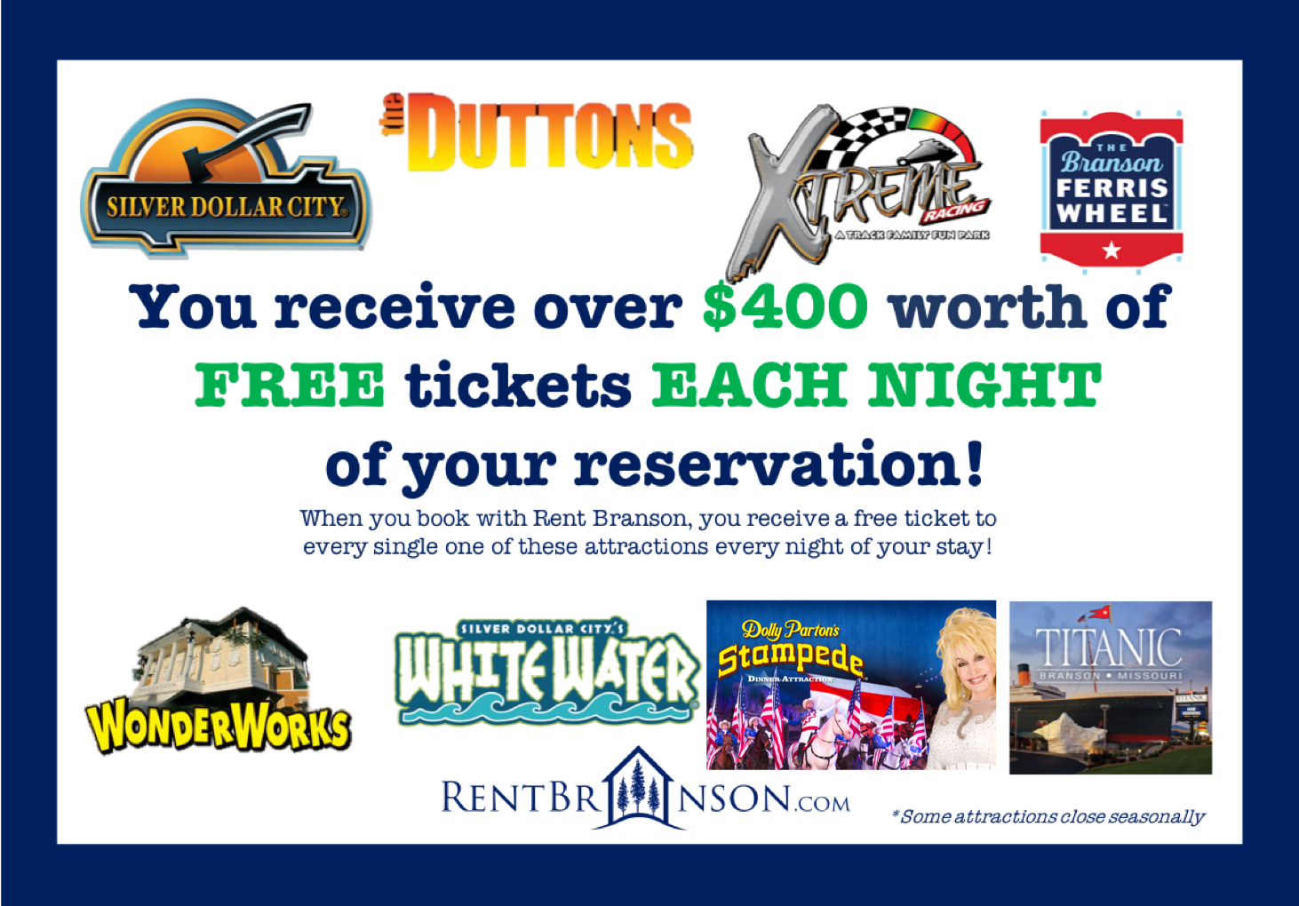 When you choose to book with Rent Branson, you’ll receive a fantastic array of complimentary tickets to some of the city’s most popular attractions. Every night of your stay, you’ll receive free tickets to Silver Dollar City, Wonder Works, White Water, Xtreme Racing, the Branson Ferris Wheel, the Titanic, Adventure Ziplines of Branson, and The Duttons. With each night booked you receive over $400 worth of tickets, so you’ll be getting more than just a place to stay – you’ll be receiving a gateway to incredible adventures!