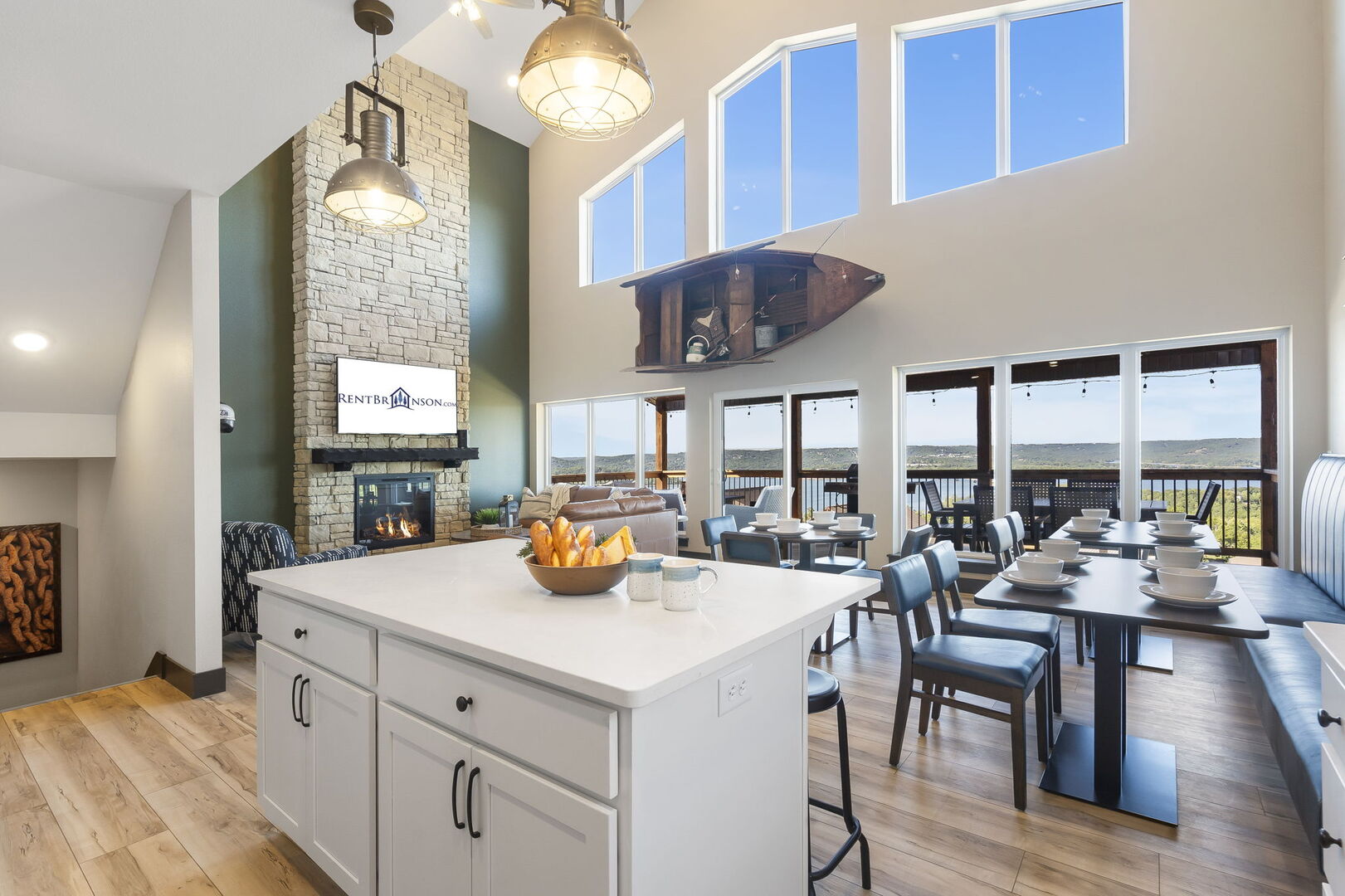 The main level of Bridge View Boat House at Table Rock Lake offers an open living space that welcomes you with its cozy atmosphere. The living area is furnished with ample comfortable seating, great for movie nights by the fireplace or conversations sparked by the unique decor. The large windows allow plentiful natural light to stream in while offering stunning views of the Ozarks. Head into the fully-equipped kitchen equipped with modern appliances and everything that you need to prepare your favorite meals. The kitchen also boasts a spacious island that provides ample counter space so everyone can help! Enjoy meals at the booth-style seating that connects you to the outdoors. Grill up some food with a view or relax in the fresh air on the main level deck. You'll find two king bedrooms with ensuite bathrooms on the main level. This property is equipped with an E Charger too for your vehicle!
