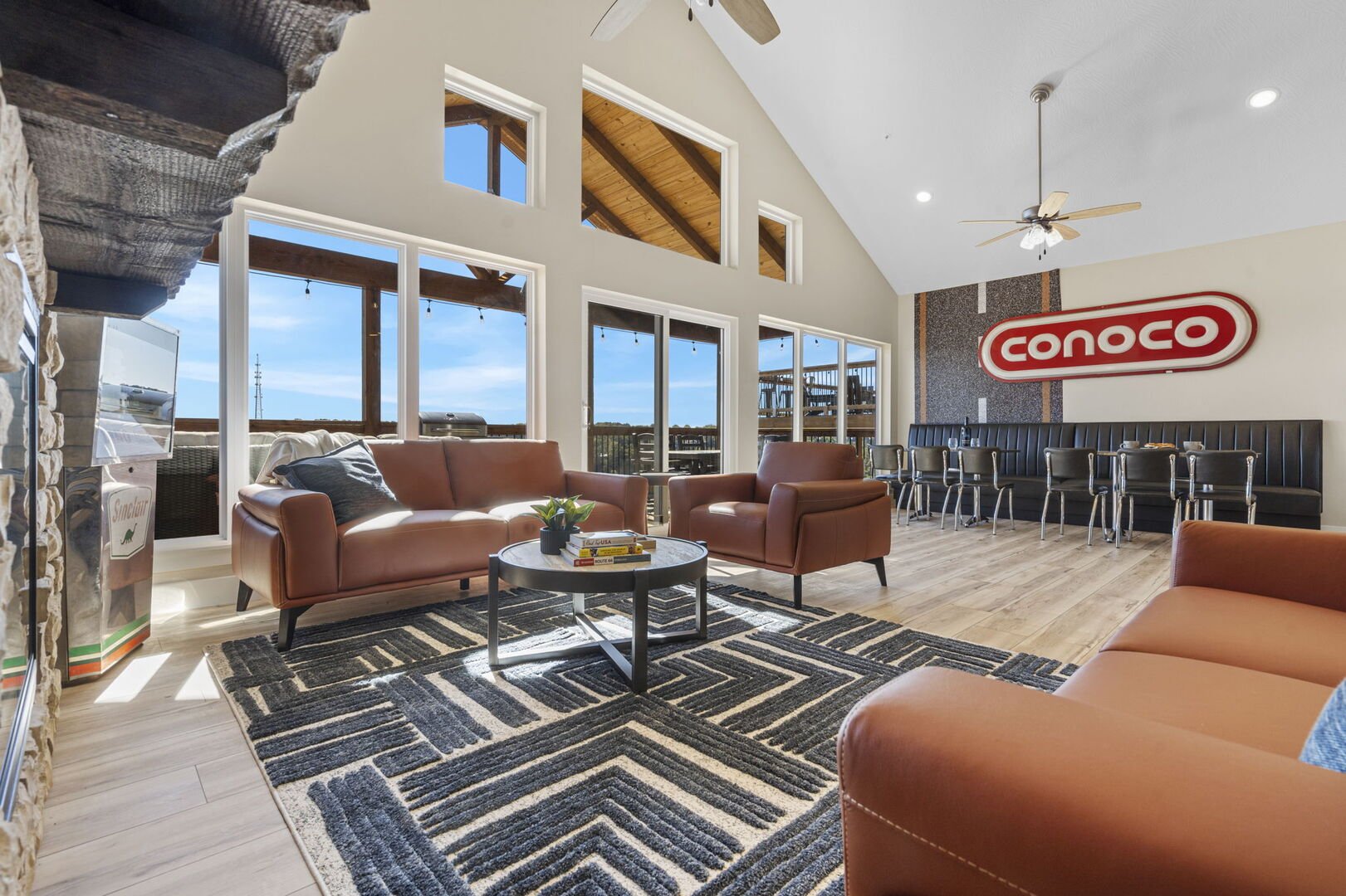 Make your way down to the lower level and discover another living area with a wet bar, foosball, arcade, oversized connect four, and a blue tooth jukebox – your perfect memory-making kit. The lower level also features two more king ensuite rooms offering even more comfort and privacy, while an additional room with two twin over full bunk beds and an ensuite bathroom is perfect for kids or extra guests. The patio area with a private hot tub and outdoor seating is the ultimate spot for a relaxing soak after a long day exploring Branson.