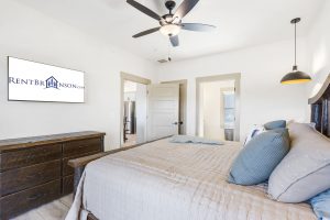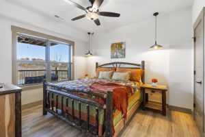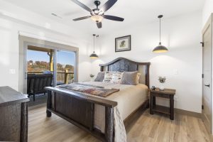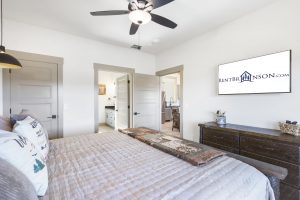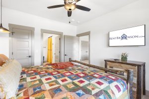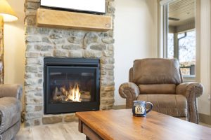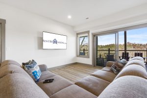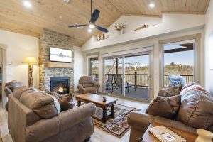 As you step through the front door, you’ll be greeted by a fully-equipped kitchen ready to inspire your culinary creativity. Whether you’re in the mood to prepare a gourmet four-course meal or simply want to pop some popcorn for a cozy movie night, this kitchen has you covered. The living room features comfortable furniture that invites you to snuggle up by the floor-to-ceiling stone fireplace – an ideal spot for enjoying a good book or a family movie night.